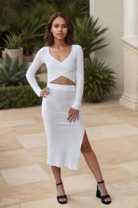 Gonna aderente trama a spiga, elastico in vita e spacco laterale.