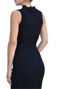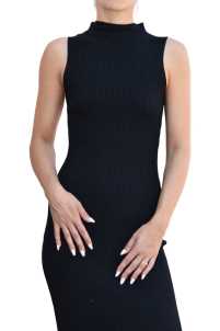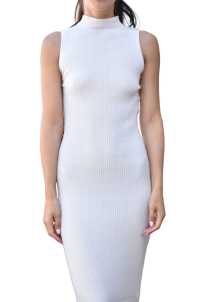Abito elasticizzato a costina, smanicato con collo a vulcano.