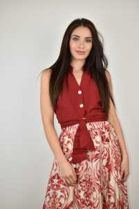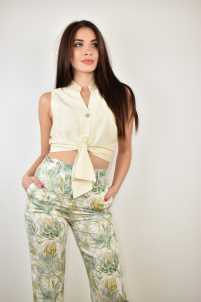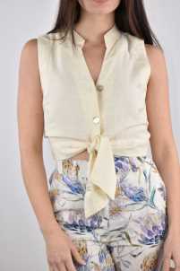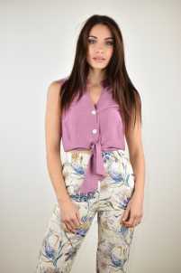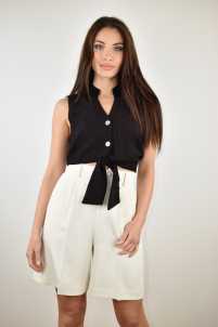 Camicia smanicata in viscosa, chiusura con bottone e nodo in vita.