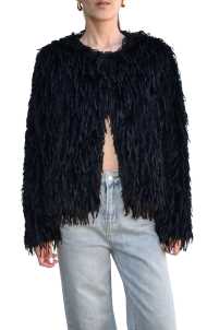 Pelliccia pelo piumata a girocollo, maniche lunghe e chiusura con Clip.