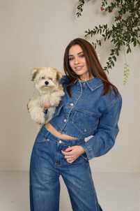 Giubbino di jeans over crop compleo Silvia, design a cinque tasche, chiusura con bottoni.