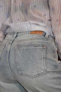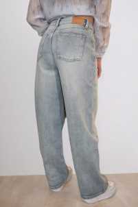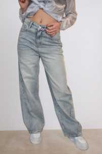 Jeans straight wide vita bassa, design a cinque tasche, chiusura con zip e bottone.