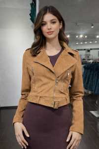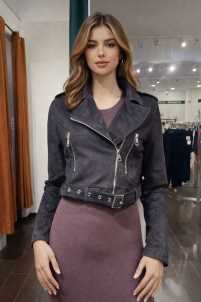 Chiodo in dainetto, maniche lunghe collo revers, cintura e zip laterale.